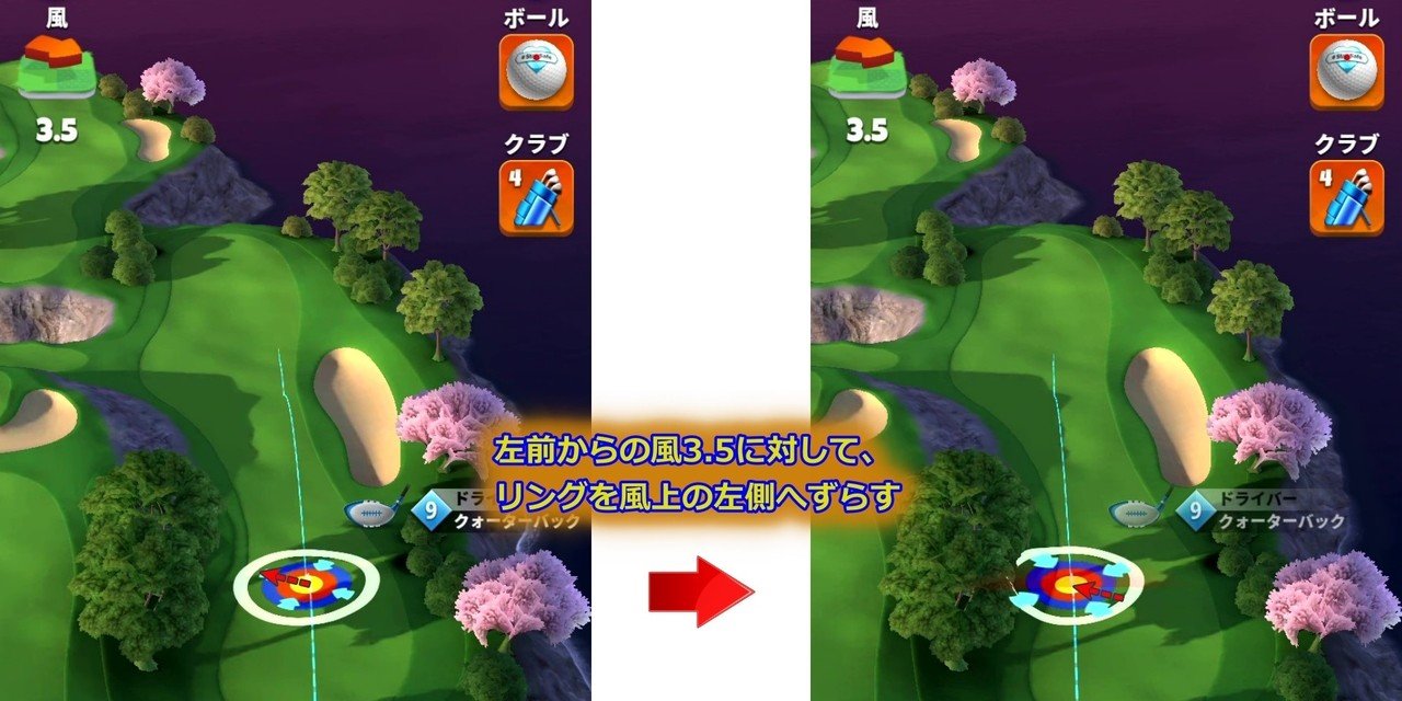 例えば、正確性50のクラブなら、リング1つあたり、風2相当にあたります。だから、風が6だったら、リングで3つ分をずらします。